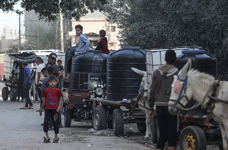 当地时间2023年10月30日,加沙地带汗尤尼斯,由于以色列暂停供水,导致水危机,人们排队等待给水箱加水。