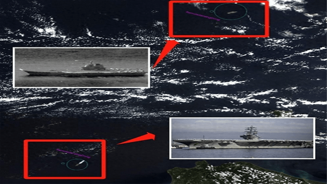 (图解:商业卫星照片中,中国山东舰航母编队与美国里根号航母编队同框)