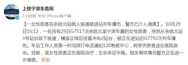 10月29日16:12,一名持有29日G7517次余姚北至宁波车票的女性旅客,突然从余姚北站3号站台跳下股道,横穿正线后径直冲向2站台,被正在进站的G7792次列车撞伤。车站工作人员第一时间拨打电话通知120急救中心,将受伤旅客送往医院救治。目前,该女性旅客正在医院治疗,生命体征平稳。相关具体情况警方正在进一步调查。
