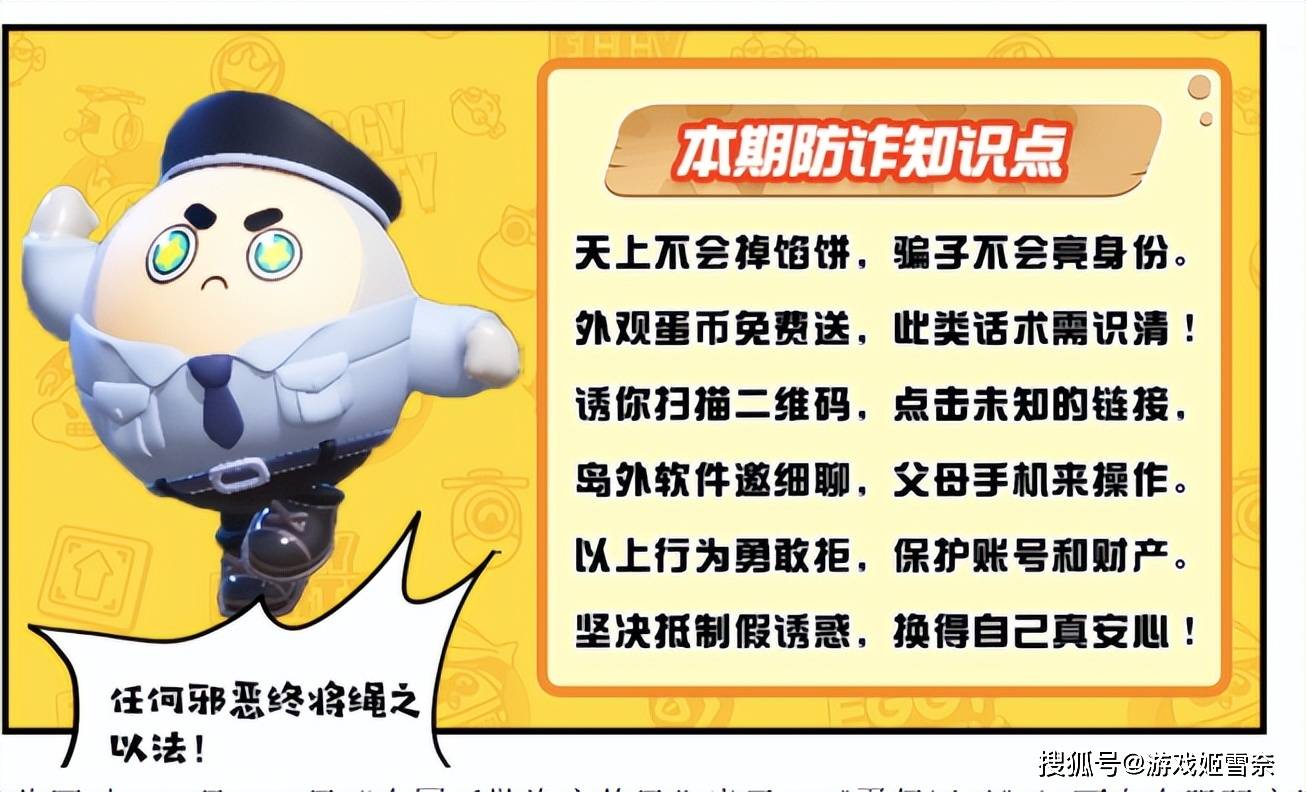 为了更有效地提升未成年人的反诈技能,《蛋仔派对》还设计了一套趣味的反诈漫画,将蛋仔形象融入作品中,为年轻玩家群体上了一堂生动的反诈课。同时,游戏还在“全国反欺诈宣传日”当天向全体玩家发送反诈邮件,以朗朗上口的语句宣传网络反诈,进一步提升每位玩家的反诈防诈能力。这些举措有效地提升了未成年人的反诈意识,为他们的健康成长保驾护航。