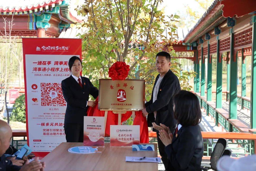 现场,张家湾人民法庭庭长晋怡和烧酒巷村党支部书记、村委会主任张志国一同为北京市通州区人民法院在张家湾镇烧酒巷村设置的普法驿站揭牌。