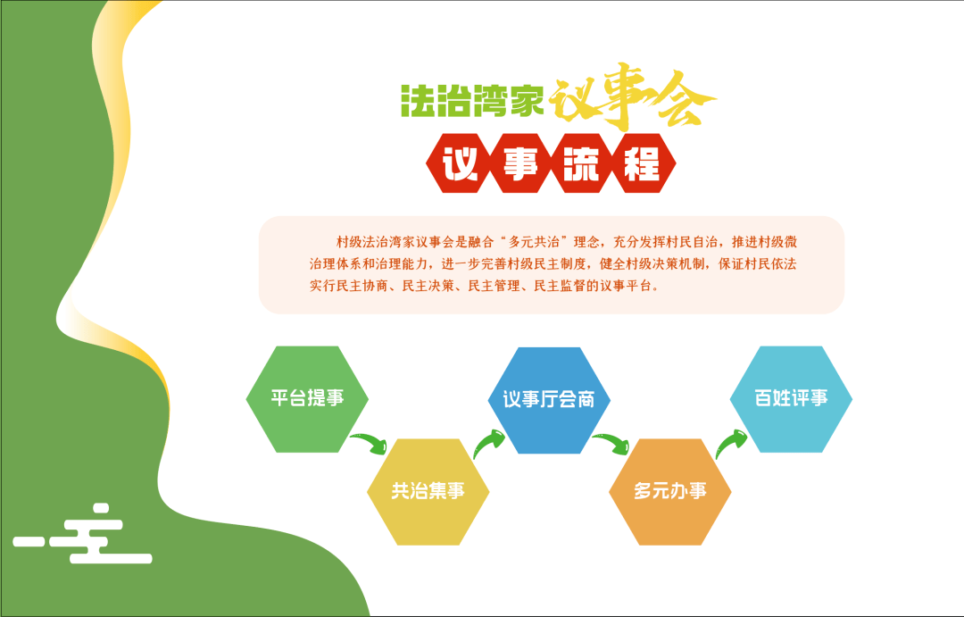 村级“法治湾家”议事会是融合“多元共治”理念,充分发挥村民自治,推进村级微治理体系和治理能力,进一步完善村级民主制度,健全村级决策机制,保证村民依法实行民主协商、民主决策、民主管理、民主监督的议事平台。同时,村级“法治湾家”议事会也是“走动式协商”模式的缩影,把群众参与基层治理的平台设立在家门口,拓宽群众参与基层治理的路径。