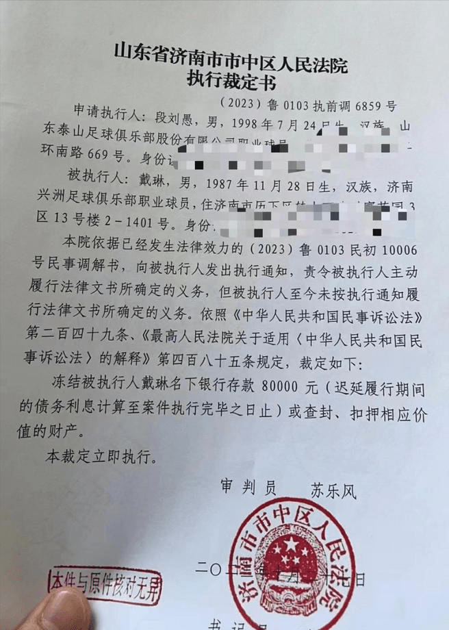 北京时间2023年10月30日,一则山东省济南市市中区人民法院的执行裁定书开始在网络上流传。这份裁定书的两位主角,是曾在山东泰山有过队友经历的戴琳和段刘愚。这份裁定书显示,法院已通过了段刘愚提出的冻结戴琳名下银行存款的申请,即日起就将正式执行。令人唏嘘的是,此次的执行标的只有区区8万元。也就是说,昔日鼎鼎大名的铁卫戴琳,如今连8万元都想赖下。即便这8万元的债主是曾经与自己并肩作战的俱乐部队友,戴琳也不想乖乖还钱。