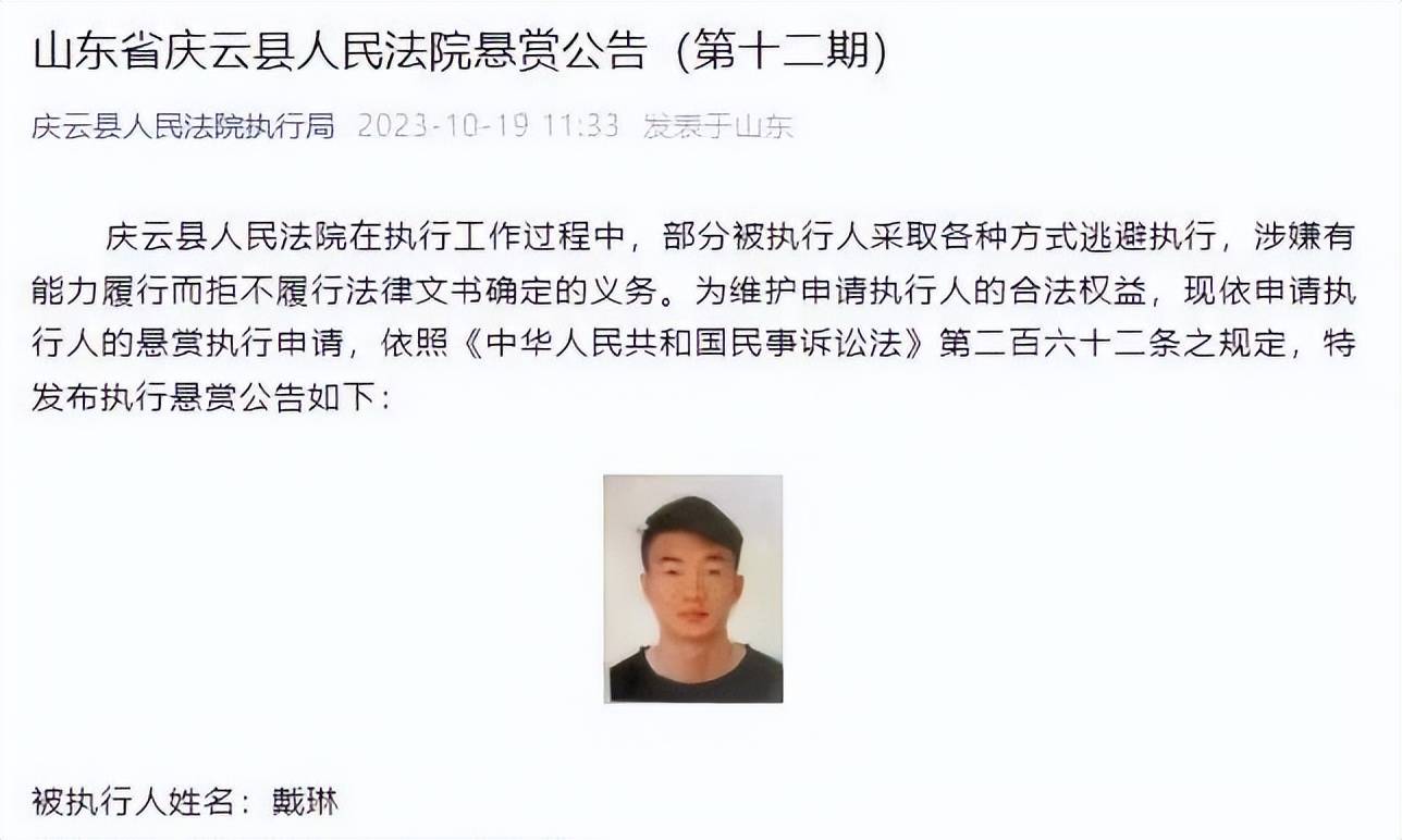 实际上,有关戴琳的另一份悬赏公告,已在本月的稍早时候被庆云县人民法院公开发布了。庆云县法院在公告上毫不客气,直接公开列出了戴琳拒不还钱,并用各种方式逃避执行的行为。除此之外,悬赏公告中还指出,凡举报戴琳财产线索者,可得到执行人财产变价款5%的悬赏金。一时间,P着戴琳头像的搞笑悬赏图片开始在网络上爆火。戴琳本就不佳的个人形象,也彻底跌入了谷底。