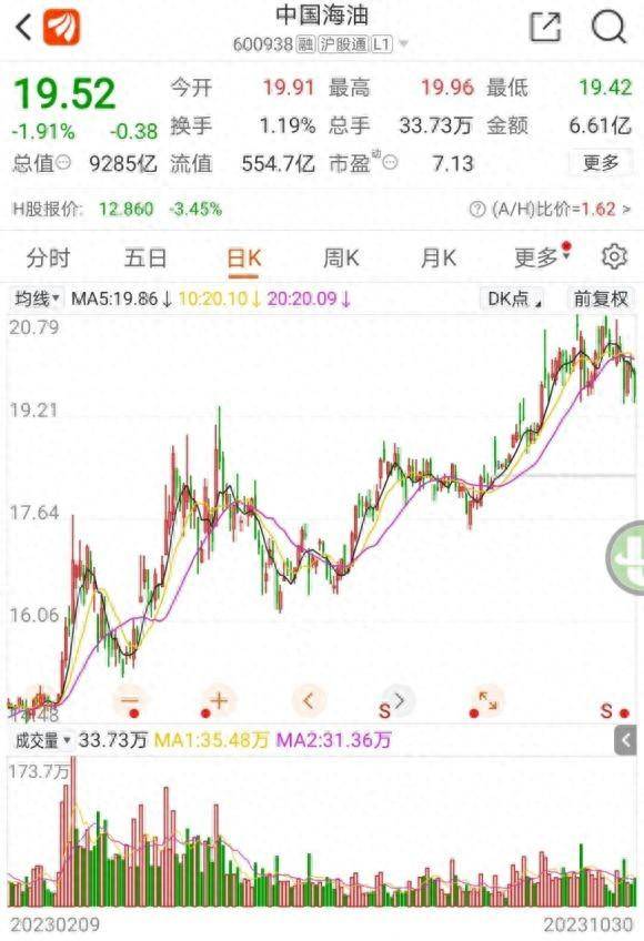 由于业绩不及预期,财报发布次日,中国海油股价一路下行,收盘下跌2.82%,股价报收19.63元/股。