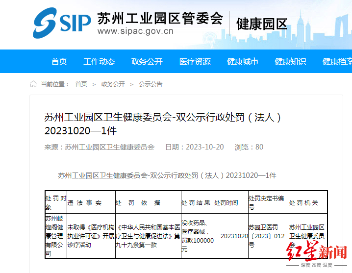 近日,苏州工业园区卫生健康委员会公布了一则行政处罚事项:苏州岐煌阁健康管理有限公司因未取得《医疗机构执业许可证》开展诊疗活动,被罚款10万元,并没收药品和医疗器械。