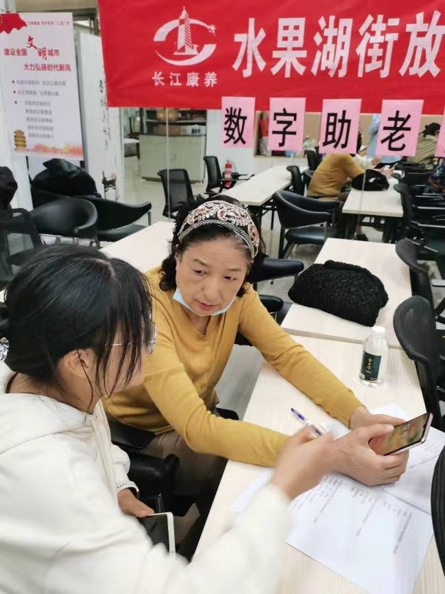 为解决社区老年居民使用智能手机难的问题,当天,社区联合长江康养集团、武汉中南财经大学法律系青年志愿者举办“数字助老 智享生活”手机运用课堂活动。活动以60岁以上的老年居民为服务对象,志愿者首先向他们详细介绍智能手机的功能、使用方法、注意事项,并一对一指导他们使用无线网络连接、微信好友添加及视频语音通话、应用市场软件下载、支付宝的使用、垃圾软件清理等智能手机操作方法,直到他们完全掌握操作步骤。