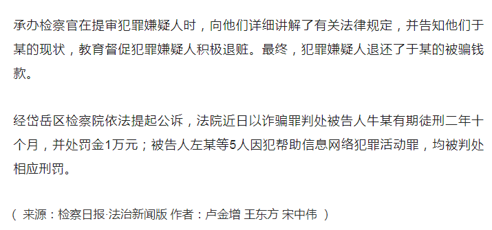 经过法院审判,牛某被以诈骗罪,判处有期徒刑二年十个月,并处罚金一万元。