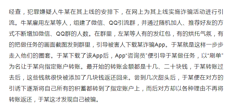 以“刷单”的名义,让受害者向指定账户转钱。