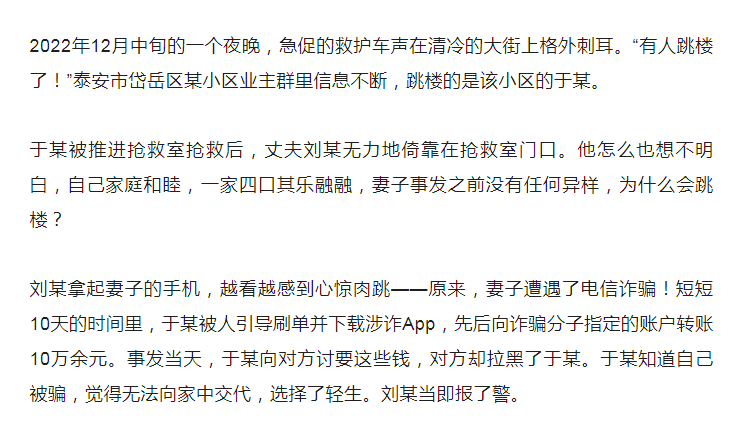 发现自己被骗后,于某感觉无法向家中交代,最终选了轻生。