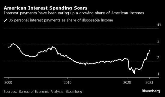 如果说过去两年大部分时间里的经济主题是通胀的影响(通胀率于2022年触及40年高点),那么现在,美国居民承受的痛苦越来越多地来自于美联储加息的副作用。据消费者金融保护局的数据,仅信用卡一项,美国消费者去年就支付了创纪录的1,300亿美元的利息和费用。