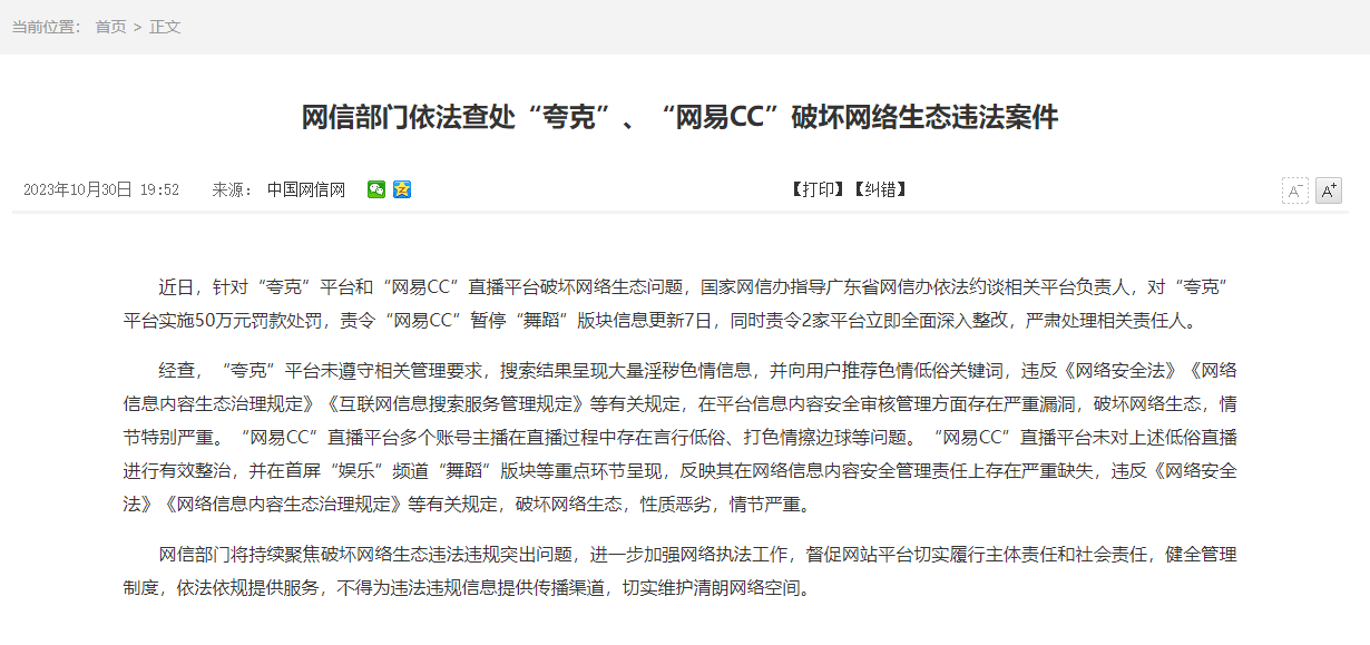 原标题:网信部门依法查处"夸克"、"网易CC"破坏网络生态违法案件