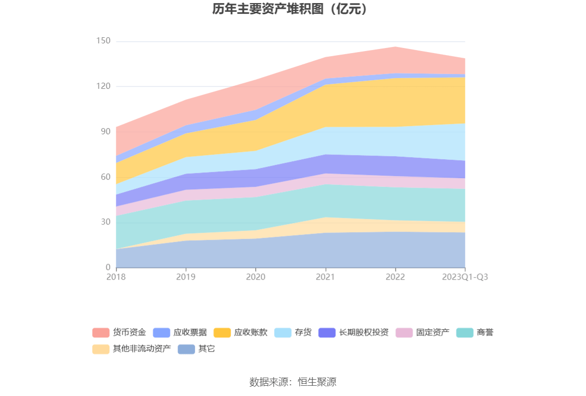资产重大变化方面,截至2023年三季度末,公司货币资金较上年末减少40.70%,占公司总资产比重下降4.50个百分点;存货较上年末增加26.53%,占公司总资产比重上升4.46个百分点;应收票据较上年末减少35.01%,占公司总资产比重下降0.70个百分点;长期股权投资较上年末减少10.55%,占公司总资产比重下降0.50个百分点。