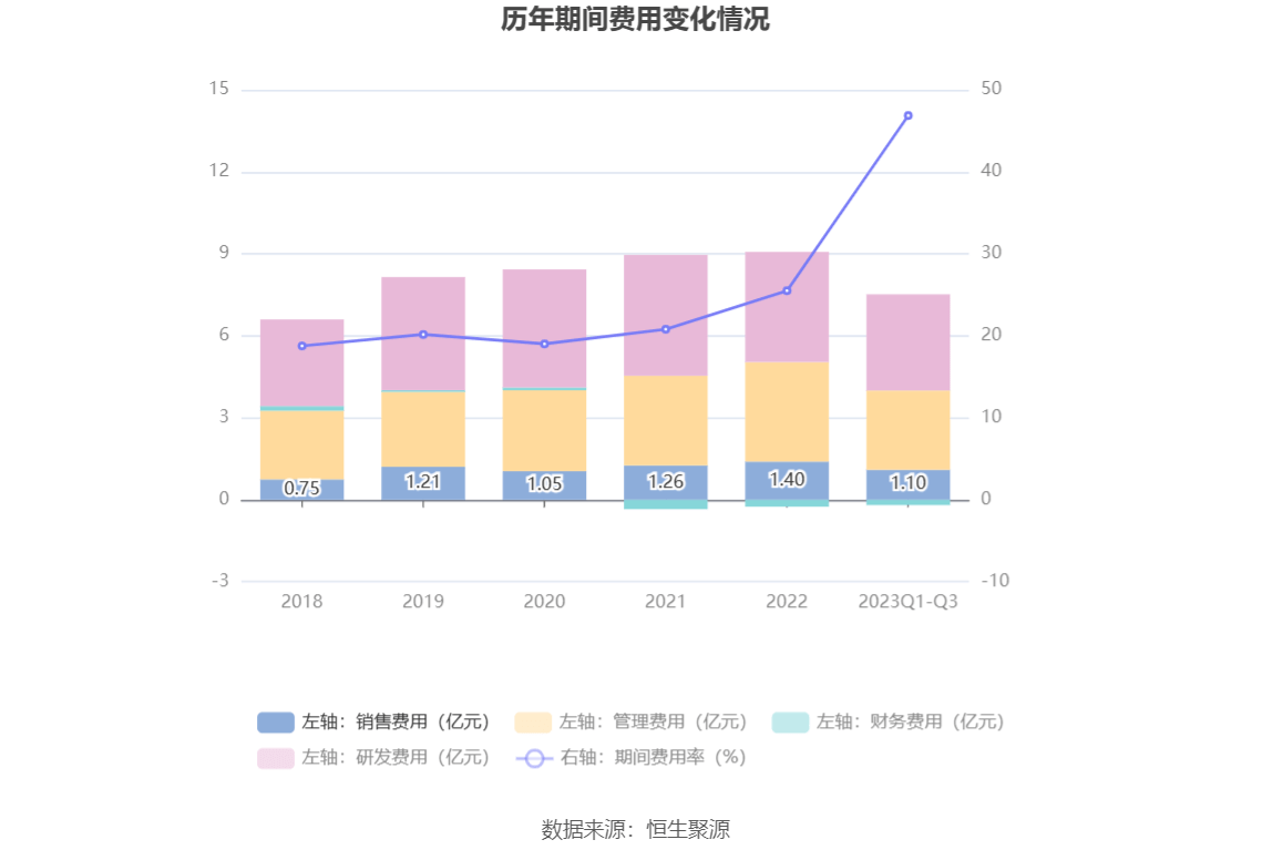 2023年前三季度,公司期间费用为7.33亿元,较上年同期增加7498.50万元;期间费用率为46.86%,较上年同期上升20.23个百分点。其中,销售费用同比增长1.56%,管理费用同比增长9.05%,研发费用同比增长15.37%,财务费用由去年同期的-2145.52万元变为-1914.31万元。