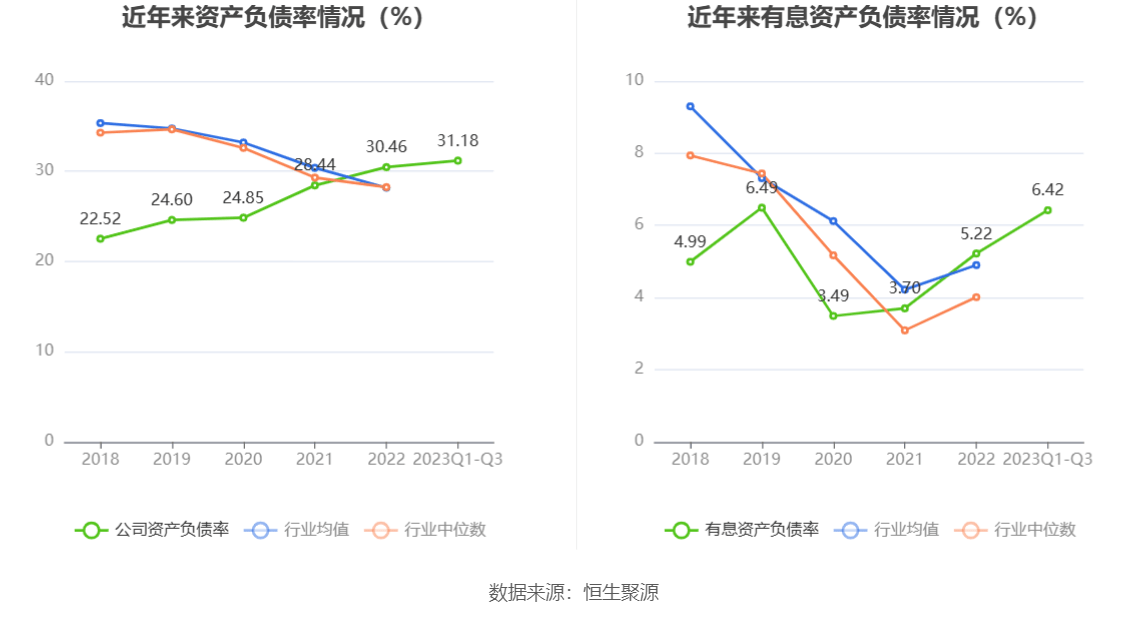 在偿债能力方面,公司2023年三季度末资产负债率为31.18%,相比上年末上升0.72个百分点;有息资产负债率为6.42%,相比上年末上升1.20个百分点。