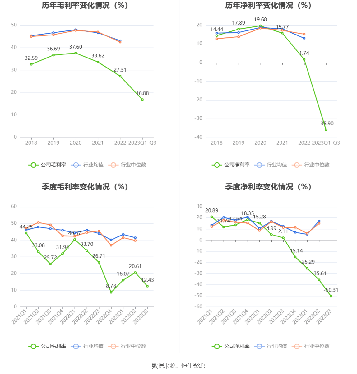 2023年前三季度,公司毛利率为16.88%,同比下降17.83个百分点;净利率为-35.90%,较上年同期下降44.38个百分点。从单季度指标来看,2023年第三季度公司毛利率为12.43%,同比下降14.28个百分点,环比下降8.18个百分点;净利率为-50.31%,较上年同期下降52.42个百分点,较上一季度下降14.70个百分点。