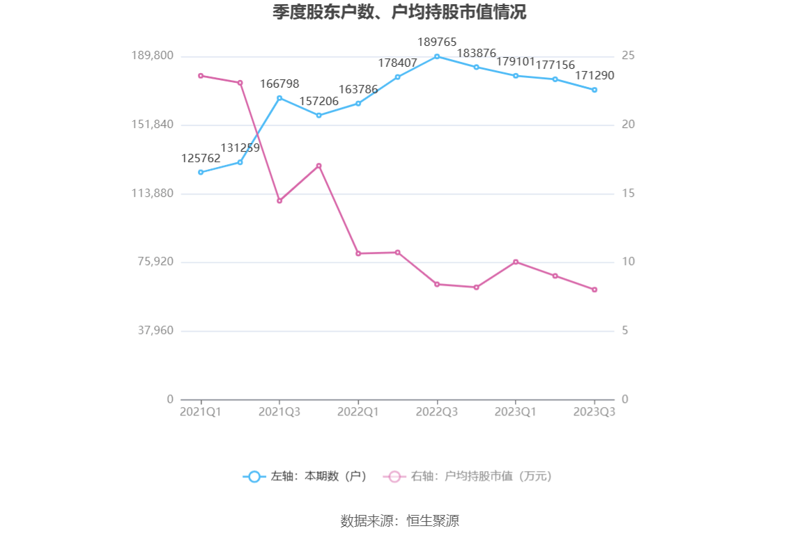 筹码集中度方面,截至2023年三季度末,公司股东总户数为17.13万户,较上半年末下降了5866户,降幅3.31%;户均持股市值由上半年末的9.02万元下降至8.02万元,降幅为11.09%。
