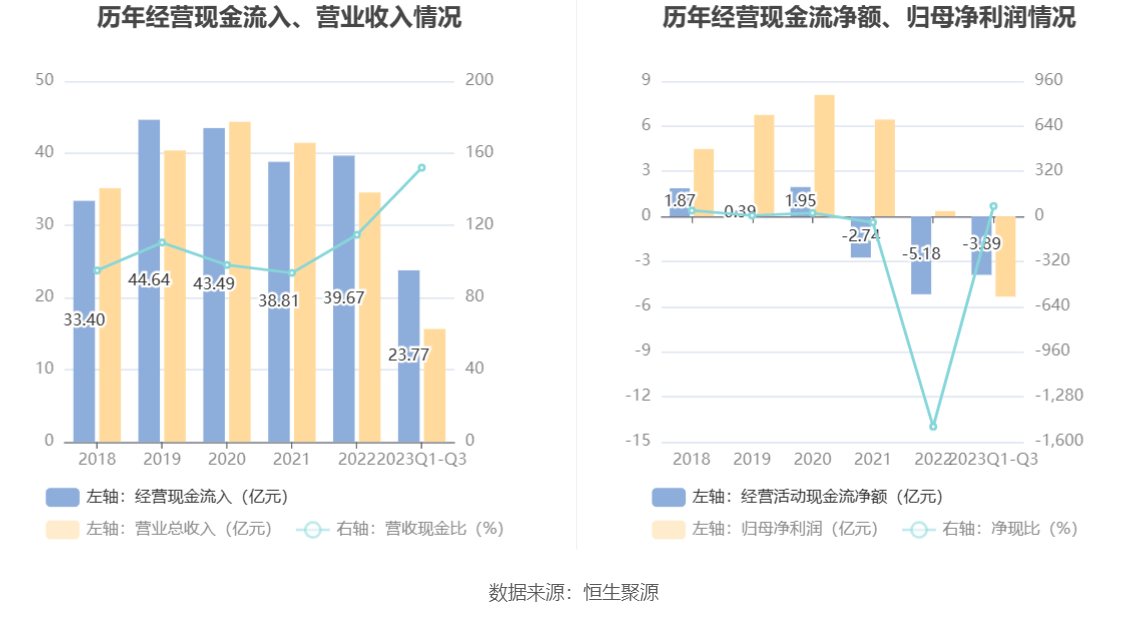 2023年前三季度,公司经营活动现金流净额为-3.89亿元,同比增加5.28亿元,主要由于公司加大应收款项催收,合理开支安排,优化保证金收支,以及新增1.6亿元应收账款保理所致;筹资活动现金流净额-2.40亿元,同比减少8.07亿元;投资活动现金流净额-1.92亿元,上年同期为-1907.82万元,主要由于本期通知存款增加所致。