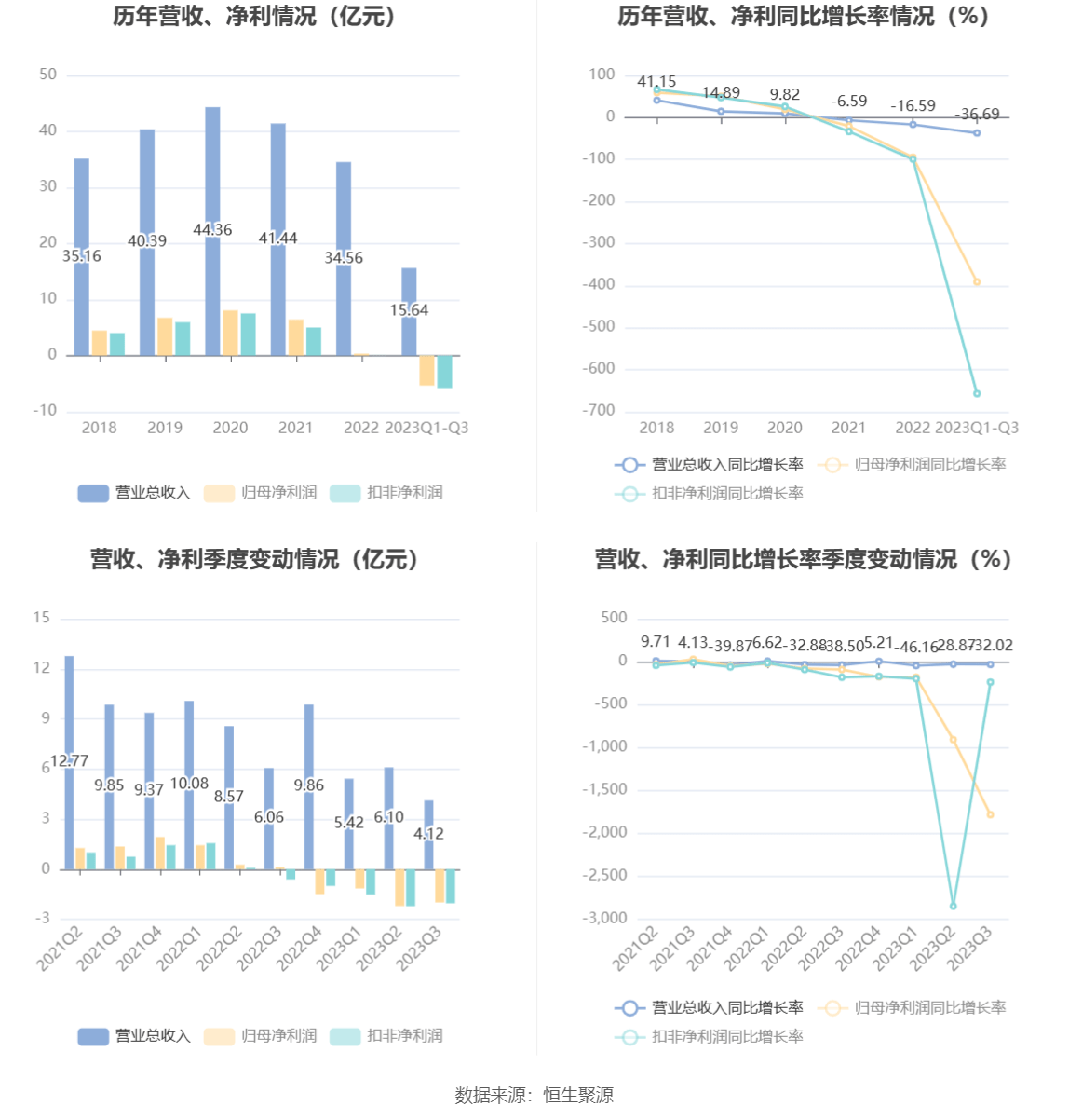 根据三季报,公司第三季度实现营业总收入4.12亿元,同比下降32.02%,环比下降32.43%;归母净利润-1.99亿元,同比下降1781.67%,环比增长9.80%;扣非净利润-2.04亿元,同比下降237.29%,环比增长7.68%。
