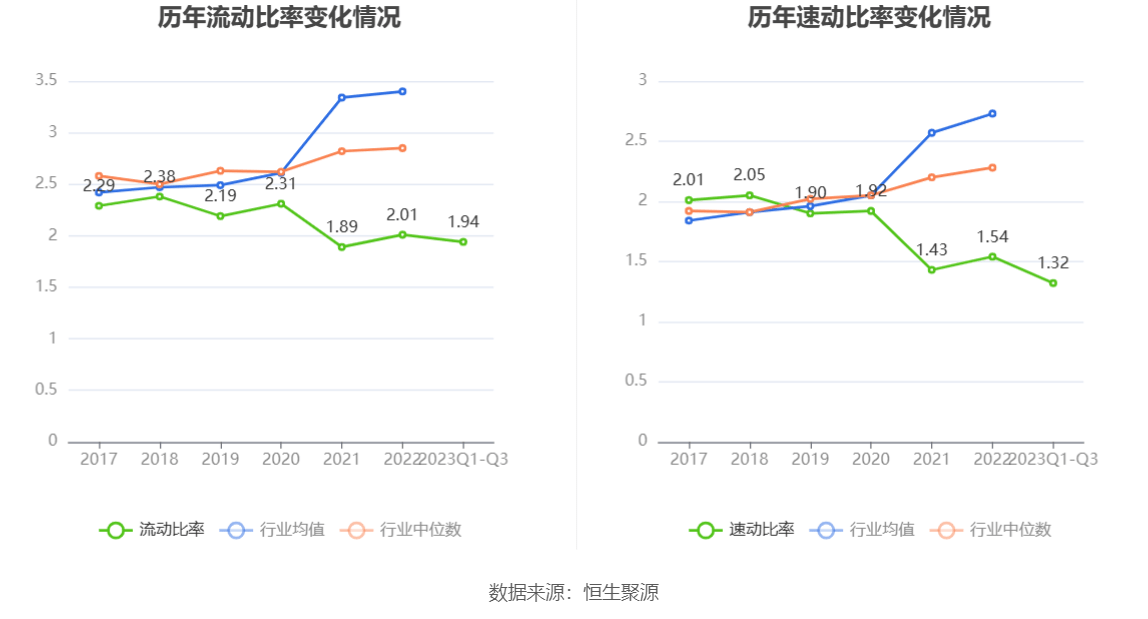 2023年前三季度,公司流动比率为1.94,速动比率为1.32。