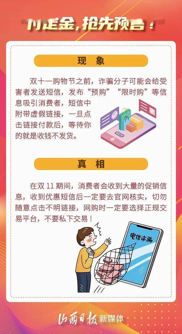 随着一年一度的“双十一”电商购物节临近,各大电商平台也都开始开启不同形式的促销预热活动,与此同时,不法分子也在伺机而动,为了避免大家落入骗局,下面为大家盘点近期出现的新型诈骗套路,戳穿骗子的真面目,守护好你的钱袋子。