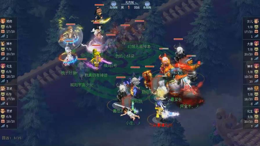 第3回合,对战方地府直接开启无间地狱,然后双凌波城用翻江搅海打面伤,最后神木林还使用了侵蚀法术,想要点掉观战方神木林。不过观战方女儿村先手盖上了罗汉,防住了对手的进攻。