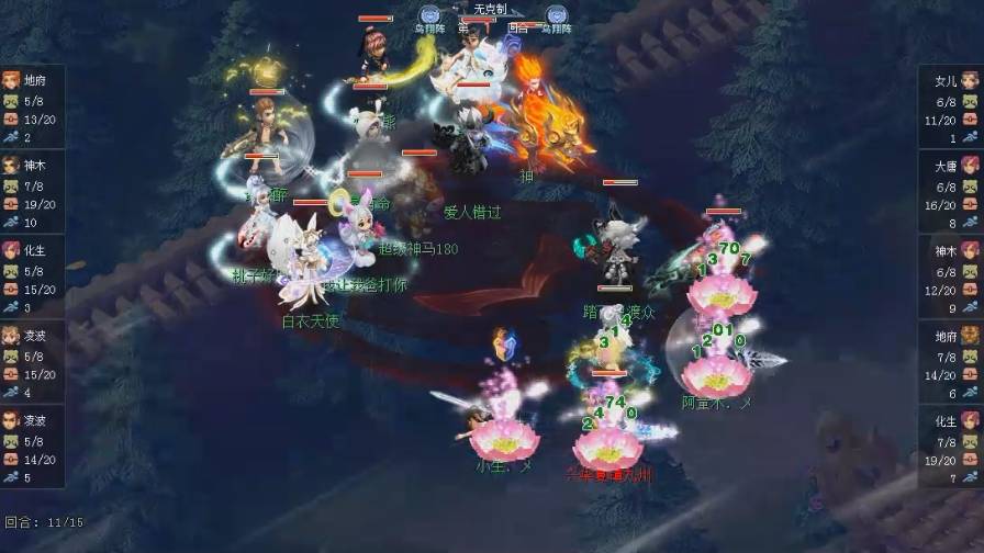 第11回合,观战方用配速宠拉起大唐,然后大唐使用风林火山,最后配速宠还拉起了女儿村,让女儿村喝酒。下回合,观战方女儿村在其疾如风的加持下,先手使用慈航,复活了地府、大唐和神木林。可惜对战方的面伤太猛了,不仅击杀了女儿村,还秒倒了满血的大唐。