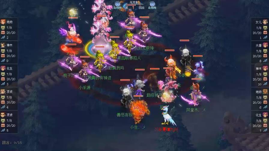 第8回合,观战方女儿村没有足够的愤怒来水清,而且他的速度比地府快,也没办法喂五龙,根本没办法防守。对战方地府给化生挂上小死亡之后,化生和凌波城召唤瞬法须弥宠,成功击杀了化生和地府。随后对战方右置位凌波城用天崩地裂配合神木林的群秒还带走了观战方女儿村。