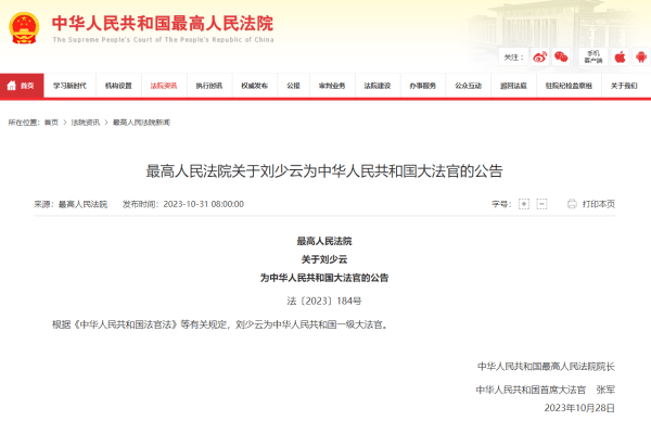 据最高人民法院网站10月31日消息,最高人民法院公告,根据《中华人民共和国法官法》等有关规定,刘少云为中华人民共和国一级大法官。