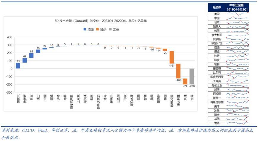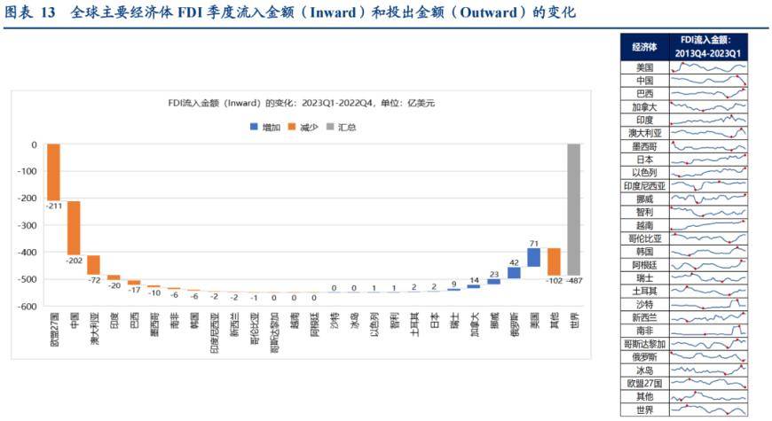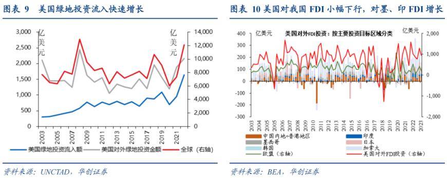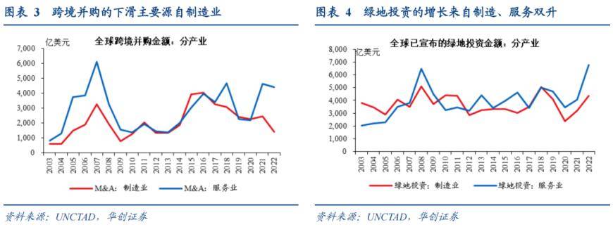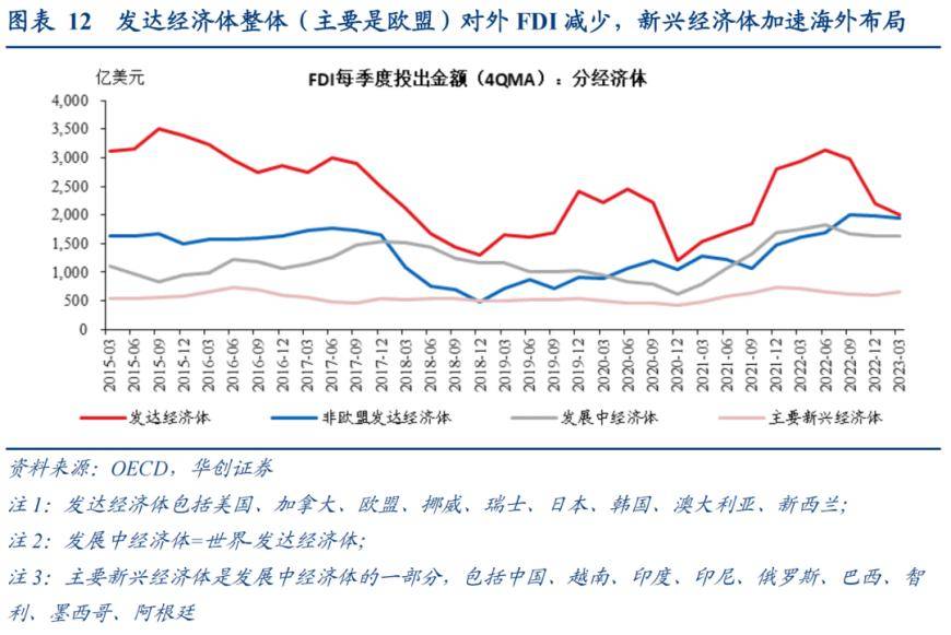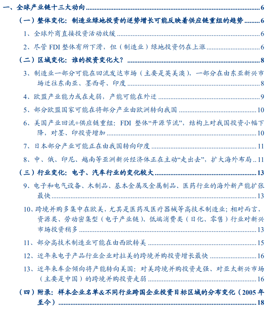 疫情、地缘冲突等一系列事件正在深刻重塑全球经贸关系,其中产业投资变化受到瞩目。对产业投资变化的理解有两个维度:(1)一维视角,产业投资的去向区域和行业有什么变化。(2)二维视角,一是投资者×被投资者,谁对谁的投资增加/减少;二是行业×被投资区域,哪个行业对谁的投资增加/减少。为了尝试捋清上述产业投资变化的脉络,本文综合宏微观视角,宏观层面,主要是一维视角,观察各国对外直接投资的投向区域,并重点关注其中的绿地投资(指外国直接投资人在东道国新建投资或扩张产能,比如置办一家新工厂,或者增加现有工厂的产能。绿地投资的变化可能更多反映出产业链重组的影响,即在原来无产能的地方新建产能)。微观层面,提供二维视角的补充,观察大型非金融跨国企业的跨国并购目标区域和行业。主要有以下发现:一、整体变化:制造业绿地投资的逆势增长可能反映着供应链重组的趋势1、全球外商直接投资(FDI)活动放缓(2022年,全球FDI流量占GDP比例降至1.3%,创2005年以来新低),指向海外产业投资趋势减弱。背后是对全球经济下行的担忧、疫情期间生产链中断、俄乌冲突等因素的共同作用。2、尽管FDI整体有所下滑,但绿地投资仍在上涨,尤其是近年来,在制造业跨境并购快速回落的背景下,制造业的绿地投资却有所增长,背后或受到产业链重组的驱动。FDI主要有两种模式:跨境并购和绿地投资。从定义出发,若外国投资者计划重组产业链,降低对某一地区的供给依赖,增加其他地区的供应,那其很可能加大对“其他地区”的绿地投资。二、区域变化:发达回流,新兴“出走”;部分产业可能在由欧迁中、由中迁墨印东南亚。3、制造业一部分可能在回流发达市场(主要是英美澳,绿地投资流入额增长较快),一部分正在由包括我国内地及香港、台湾地区等在内的东亚新兴市场转向东南亚(主要是越南和印尼)、墨西哥、印度(东亚新兴市场的绿地投资流入额快速下降,东南亚、墨、印的绿地投资流入额则明显增长)。4、欧盟产业能力或在走弱(近期FDI流入和流出均大幅下降,显示欧盟企业的投资和引资能力呈下滑趋势,背后或反映欧盟的产业能力在走弱),产能或有一定程度的外迁(绿地投资流出的增长明显快于绿地投资流入,绿地投资净流出加速)。5、部分欧盟国家可能在将部分产业由欧洲转向我国。受数据可得性限制,以德国、荷兰为代表,近期,其对外直接投资整体大幅下滑,但对我国内地及香港地区的FDI却快速提升,与之相对的是对其他欧盟国家FDI的大幅下降。6、美国产业回流+供应链重组的趋势,表现在其直接投资整体“开源节流”(自身吸引更多外资,特别是近年来绿地投资流入增长较快;同时减少对外投资),结构上,对我国FDI小幅下行,对墨西哥、印度FDI增加。2023Q1-2023Q2,美国对外直接投资下降14亿美元至979亿美元(4QMA,表示4个季度移动平均)。其中,对我国内地及香港地区的直接投资下降了0.4亿美元至33.5亿美元(4QMA),对印度和墨西哥的直接投资上涨1.4亿美元至54亿美元(4QMA)。7、日本部分产业可能正在由我国转向印度(对我国FDI下滑,对印度FDI增长)。2023Q1-Q2,日本对我国内地及香港地区直接投资由27.2亿美元(4QMA)降至25.2亿美元(4QMA),对印度直接投资由7.3亿美元(4QMA)升至7.9亿美元(4QMA)。8、中、俄、印尼、越南等亚洲新兴经济体正在主动“走出去”,扩大海外布局(对外直接投资增加)。三、行业变化:关注电子、汽车行业的“外迁”倾向9、电子和电气设备、木制品、基本金属及金属制品、医药行业的海外新产能扩张最快(近5年绿地投资增长最快),可能也意味着这四个行业内进行的海外产业链重组较多。10、从大型跨国企业的跨境并购活动来看,跨境并购的目标区域多集中于欧美(西欧+美国),特别是医药及医疗器械等高技术制造业。相对而言,资源类、劳动密集型(电子产业链)、低端消费类(日化、零售)行业对新兴市场投资稍多。11、部分高技术制造业可能在由西欧转美。医药及医疗器械等高技术制造业企业对西欧的跨境并购金额占比下降,对美国的跨境并购金额占比增加。12、近年来电子产品行业企业对拉美的跨境并购投资增长最快,可能指向电子产业有部分向拉美转移的趋势。与2016-18年相比,2020-至今,对拉美投资增速(121.6%)快于亚太新兴市场(48.9%),或意味着边际上拉美对电子行业的外资吸引力在上升、亚太新兴的资金吸引力下滑。13、近年来车企倾向将产能转向美国。大型跨国车企对美跨境并购投资走强、对亚太新兴市场(主要是中国)的跨境并购投资走弱。2020-至今,汽车行业跨国企业对亚太新兴市场的跨境并购占比由2016-18年的13.2%降至9.1%,同期,对北美(主要是美国)的跨境并购占比则由42.5%升至57.3%。风险提示:数据可得性有限,样本代表性受限;数据更新滞后;当下数据波动可能不代表未来趋势,数据分析可能存在偏差。