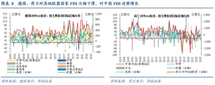 5、部分欧盟国家可能在将部分产业由欧洲转向我国受数据可得性限制,以德国、荷兰为代表,近期,其对外直接投资整体大幅下滑,但对我国内地及香港地区的FDI却快速提升,与之相对的是对其他欧盟国家FDI的大幅下降。