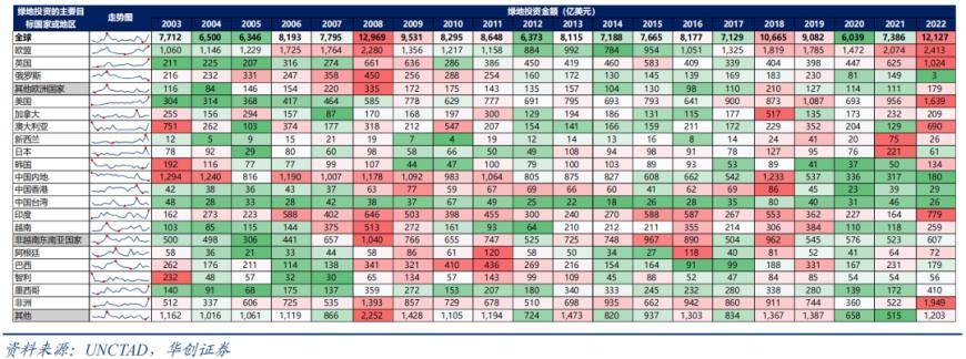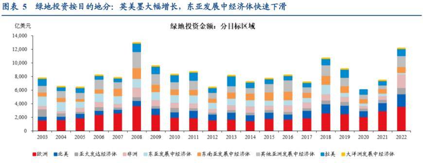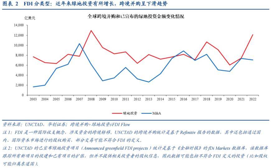 2、尽管FDI整体有所下滑,但(制造业)绿地投资仍在上涨Ø 基础知识铺垫:跨境并购和绿地投资的定义、区别FDI有两种主要模式:跨境并购(Cross Border M&A)和绿地投资(Greenfield Investment)。定义:跨境并购是指外国直接投资者收购东道国(接收投资的国家)现有企业的股权,涉及的是东道国现有企业资产产权的转移。绿地投资(Greenfield Investment)又称新建投资,本文采取其广义定义,既包括外国投资者在东道国新建项目,比如置办一个新工厂、新设一家子公司等(狭义定义),也包括对现有直接投资企业的新资本注入或产能扩张,比如增加现有工厂的产能等[1]。主要有两点区别:一是成本上,绿地投资需要比较长期的筹备与建设期,建设成本一般较高;相对而言,跨境并购所需时间成本更低,依靠东道国目标企业原有的产能、销售渠道等资源,直接投资企业能更迅速地打入东道国市场。二是投资目标区域方面,相比跨境并购,绿地投资更偏向工业化程度较低的发展中经济体。对发展中经济体的投资在绿地项目中能占50%左右,但在跨境并购中仅占不到2成。Ø 近期变化:绿地投资增长,跨境并购下滑,差异主要源自制造业。制造业的绿地投资增加,可能部分反映了产业链重组的影响(在原来无产能的地方新建产能)。早在2016年,制造业的跨境并购交易已经达峰,到2022年时累计下滑64.9%至1,423亿美元,和2012、2013年欧债危机期间基本持平。同期,制造业的绿地投资额波动上行,到2022年累计上涨45%至4,367亿美元,高于2003年以来均值(3,686亿美元)。