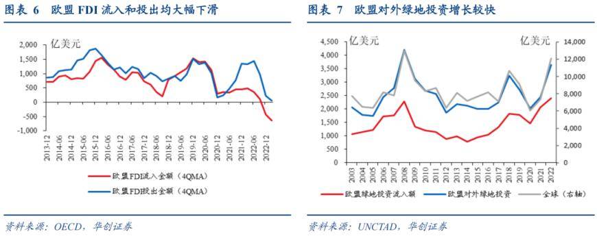4、欧盟产业能力或在走弱,产能可能在外迁从两个角度数据观察:一是欧盟的FDI流入、流出额均大幅下降,背后或反映出欧盟产业能力有一定走弱趋势。一方面,欧盟内部的产业对外资的吸引力下降,另一方面,欧盟自身的企业可能由于效益不佳、产业走弱等,对外投资减弱。①与去年四季度相比,2023Q1欧盟的FDI流入额(四个季度移动平均,4QMA)下降了211亿美元,下降数额为主要经济体中最大。②同期,欧盟的FDI投出金额(4QMA)减少了161亿美元。二是欧盟对外绿地投资金额增长较快,明显快于其绿地投资流入额,意味着绿地投资净流出加速,可能指向欧盟的一些产业有外迁趋势。2021-2022年,欧盟绿地投资流入额增长16.3%至2,413亿美元,而对外绿地投资金额则增长48.9%至3,654亿美元。