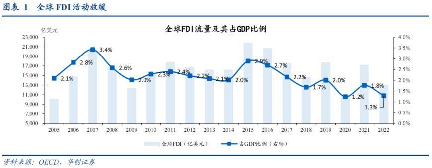 疫情、地缘冲突等一系列事件正在深刻重塑全球经贸关系,其中产业投资变化受到瞩目。对产业投资变化的理解有两个维度:(1)一维视角,产业投资的去向区域和行业有什么变化。(2)二维视角,一是投资者×被投资者,谁对谁的投资增加/减少;二是行业×被投资区域,哪个行业对谁的投资增加/减少。为了尝试捋清上述产业投资变化的脉络,本文综合宏微观视角,宏观层面,主要是一维视角,观察各国对外直接投资的投向区域,并重点关注其中的绿地投资(指外国直接投资人在东道国新建投资或扩张产能,比如置办一家新工厂,或者增加现有工厂的产能。绿地投资的变化可能更多反映出产业链重组的影响,即在原来无产能的地方新建产能)。微观层面,提供二维视角的补充,观察大型非金融跨国企业的跨国并购目标区域和行业。(一)整体变化:制造业绿地投资的逆势增长可能反映着供应链重组的趋势1、全球外商直接投资活动放缓整体来看,历史上,全球外商直接投资活动经历了两波明显放缓。第一波是2008年金融危机以后。2009年,全球的外商直接投资(FDI)流量占GDP比例由金融危机前的峰值3.4%降至2%。第二波放缓始于2016年,伴随英国脱欧、特朗普当选等,西方世界反全球化情绪发酵。2018年,全球FDI占GDP比例降至1.7%。当下,伴随疫情时期生产链中断、俄乌冲突等事件的冲击,全球FDI活动似乎正在经历第三波放缓。2022年,全球FDI流量占GDP比例降至1.3%,创2005年以来新低。