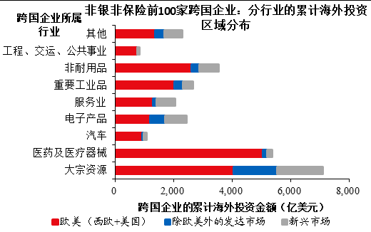 10、跨境并购多集中在欧美,尤其是医药及医疗器械等高技术制造业;相对而言,资源类、劳动密集型(电子产业链)、低端消费类(日化、零售)行业对新兴市场投资稍多Ø 数据来源与样本介绍跨国企业是进行国际产业投资的重要主体,从微观个体企业的投资行为,可以观察到更细致的信息。受数据可得性限制,我们聚焦全球大型跨国企业的跨境并购活动(如果没有特别说明,后文提到的跨国企业海外投资均指跨境并购交易的对价金额)。数据源彭博。样本选择福布斯全球企业2000强中,非银行、非保险业的前100名大型企业,行业分类标准源自福布斯。样本企业所属行业、所在国家或地区的情况详见附录1和2。Ø 主要发现①跨境并购投资多集中在欧美(美国和西欧),尤其是医药及医疗器械等高技术制造业。医药及医疗器械、汽车、重要工业品(半导体、航空航天及军工、资本货物、化工产品)行业的跨国企业累计海外投资额中,对欧美(西欧和美国)的投资占比分别达94%、86.2%、76.3%。部分原因在于,发达市场本身的产业基础使其能够孕育出有关企业(不论是产业链上下游还是同行企业),从而吸引行业内大型跨国企业的并购投资。②相对而言,资源类(大宗资源)、劳动密集型(电子产业链)、低端消费类(家居日化、零售)行业的企业对新兴市场投资稍多。与其他行业相比,服务业(主要是零售业)、电子产品、大宗资源、非耐用品(食品饮料烟草、家居日化)的跨境并购投资中,新兴市场占比居前,分别为31.5%、29.8%、21.9%、18.3%。部分原因在于,一方面新兴市场人口众多,有庞大的消费市场;另一方面,新兴市场还有充裕的、虽然技能较低但成本低廉的劳动力。