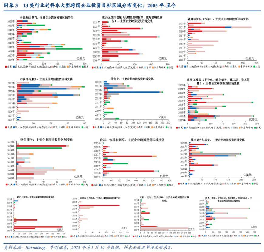 11、部分高技术制造业可能在由西欧转美Ø 数据情况和基本处理方法说明受数据可得性限制,我们观察2005年-至今样本跨国企业海外投资区域分布的变化情况。投资目标区域按大区分类,大区分类标准源自彭博。共有7大区,各区包含的主要经济体如下:(1)北美:包括美国、加拿大、百慕大;(2)西欧:包括欧盟、英国、挪威、瑞士;(3)东欧:包括俄罗斯、土耳其等国;(4)亚太地区(新兴):包括中国内地、中国台湾地区,韩国,印度,除新加坡外的东盟国家、哈萨克斯坦等;(5)亚太地区(发达):包括澳大利亚、新西兰、中国香港地区、日本、新加坡;(6)拉美:包括巴西、阿根廷、墨西哥、智利等,还包括开曼群岛、英属维尔京群岛;(7)中东与非洲:包括南非、以色列、沙特、阿联酋等国。分析对某个大区跨境并购投资的变化时,我们结合第10点静态视角下各大区累计投资中主要国家(地区)的占比情况,估计主要是哪个国家(地区)在发生变化。为了方便观察,我们以3年为一个小周期,挑选四个典型时期进行对比:(1)2005-2007年,跨境并购活动经历第一波快速增长。(2)2010-2012年,跨境并购活动经历第二波快速增长。(3)2016-2018年,跨境并购活动触顶,进入“平台期”。(4)2020-至今,跨境并购活动最新境况,快速下滑。详见图16。Ø 主要发现近年来,西欧对高技术制造业投资的吸引力降低,北美(主要是美国)仍受青睐。以医药及医疗器械、重要工业品(半导体、航空航天及军工、资本货物、化工产品)行业为例。四个典型时期(2005-2007年、2010-2012年、2016-2018年、2020-至今),上述两行业的企业对西欧的跨境并购金额合计分别为313、464、566、113亿美元,占同期上述两行业的企业总并购额的比例分别为35.3%、46.4%、33.8%、12.5%;而对北美则分别为443、385、1,019、758亿美元,占比分别为49.9%、38.6%、61.0%、83.5%。12、近年来电子产品行业企业对拉美的跨境并购投资增长最快①整体上,近年来,仅亚太地区(新兴)、拉美获得的跨境并购投资额有所提升。2016-2018年、2020年-至今,样本跨国企业对上述两地区的投资金额分别由462亿美元升至534亿美元(占比由5%升至17.2%)、131.5亿美元升至265亿美元(占比由3%升至8.5%)。②电子产品行业方面,近年来对拉美的投资增长尤为显著,与2016-18年相比,2020-至今,对拉美投资增速快于亚太(新兴),或意味着边际上拉美的外资吸引力在上升、亚太新兴的资金吸引力下滑。1)对于拉美,2005-2007年、2010-2012年,电子产品跨国企业对拉美的跨境并购投资额均为零,2016-2018年实现零的突破,升至12.7亿美元,占同期电子产品行业跨境并购总额约1.5%;2020-至今,进一步升至28.2亿美元,增速121.6%(同期对亚太新兴市场投资增速48.9%),占比升至4.1%。2)对于亚太(新兴),四个典型时期(2005-2007年、2010-2012年、2016-2018年、2020-至今),对亚太地区(新兴)的投资额分别为31.2、18.1、181、269亿美元,占比分别为89.3%、7.4%、21.3%、39.5%。13、近年来车企倾向将产能转向美国:对美跨境并购投资走强、对亚太新兴市场(主要是中国)的跨境并购投资走弱最近两段时期(2016-2018年、2020-至今),汽车行业跨国企业的跨境并购方面,亚太新兴获得的投资占比由13.2%降至9.1%(绝对金额有所提升,6.1亿美元升至31.9亿美元),而北美的占比则由42.5%升至57.3%,金额由19.8亿美元升至202亿美元。