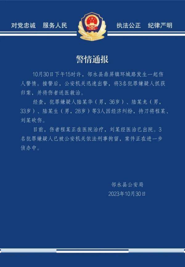 原标题:警方通报3男子因经济纠纷持刀砍伤两人:3人被刑拘