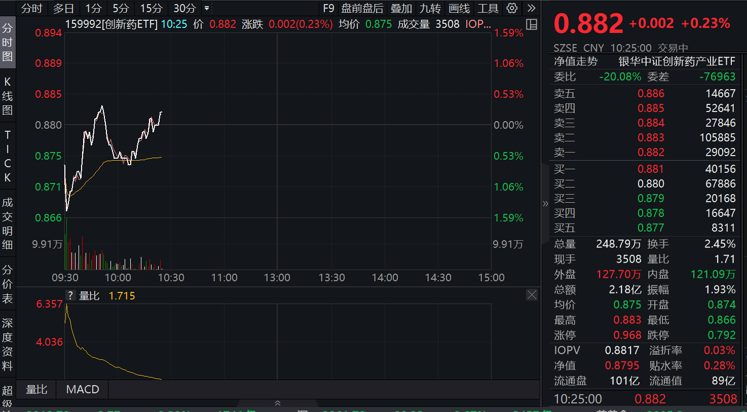 截至2023年10月31日10:25,创新药ETF(159992)盘中震荡翻红,现涨0.23%,成交额达2.18亿元,成交额持续扩大,市场交投活跃。