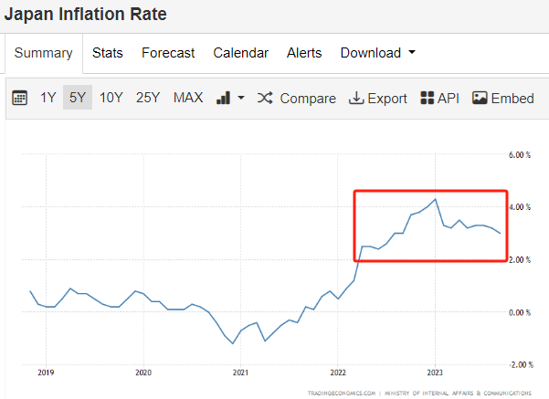 日本的通胀已经连续18个月高于日本央行2%的目标 图片来源:tradingeconomics