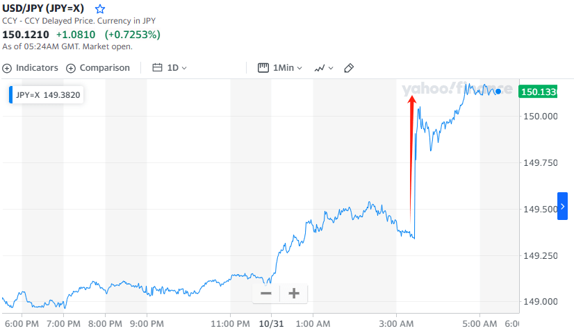 日本央行利率决议公布后,美元兑日元直线拉升重返150上方 图片来源:雅虎财经