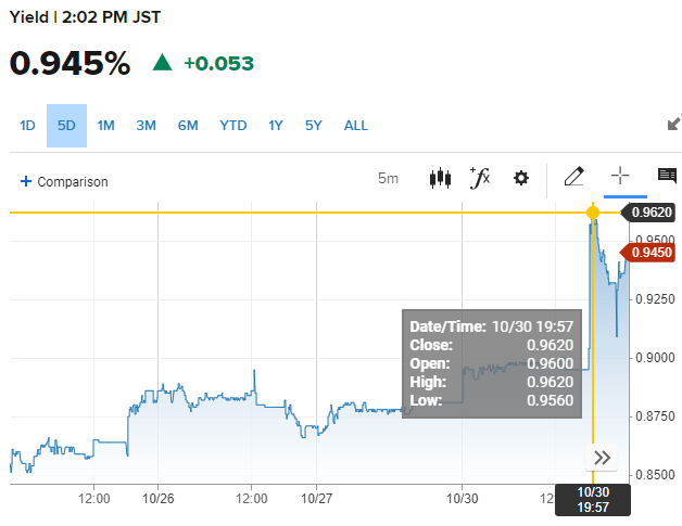 其实,此前市场对日本央行可能再次提高其基准收益率上限的预期就已有所升温,日本国债也因此遭遇剧烈抛售,10年期日债收益率不断逼近日本央行1%的收益率控制上限。与此同时,近期以10年期美债收益率为首的全球发达经济体长期国债收益率加速上行,也加大了日本央行本周会议上提高10年期国债收益率上限的压力。就在北京时间10月31日早间,即日本央行政策声明公布前几小时,10年期日债收益率还飙升至0.995%,创2013年以来新高。