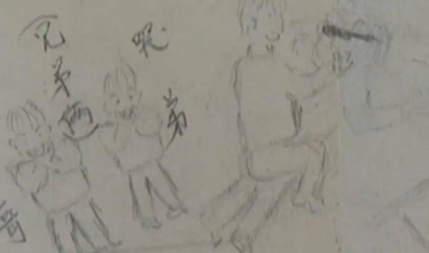 画上,妈妈在地上趴着,一个男性半蹲在妈妈身后,朝妈妈的后脑勺举着针,另外一个男人朝妈妈举着刀。他还画了两个小男孩,代表自己和弟弟,他们瞪着圆圆的眼睛,一个人无措地哭,一人大声尖叫。