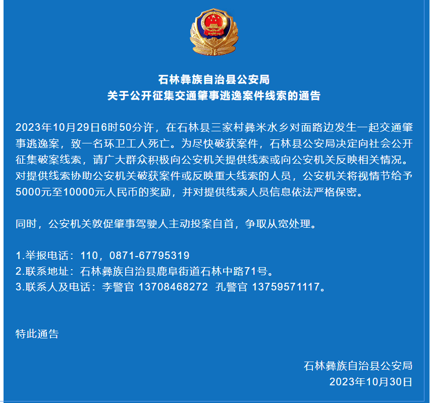 10月30日,石林彝族自治县公安局发布关于公开征集交通肇事逃逸案件线索的通告: