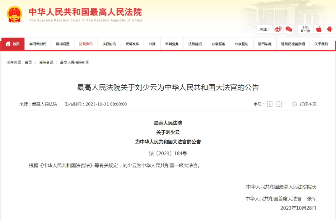 最高人民法院网站31日发布公告,根据《中华人民共和国法官法》等有关规定,刘少云为中华人民共和国一级大法官。