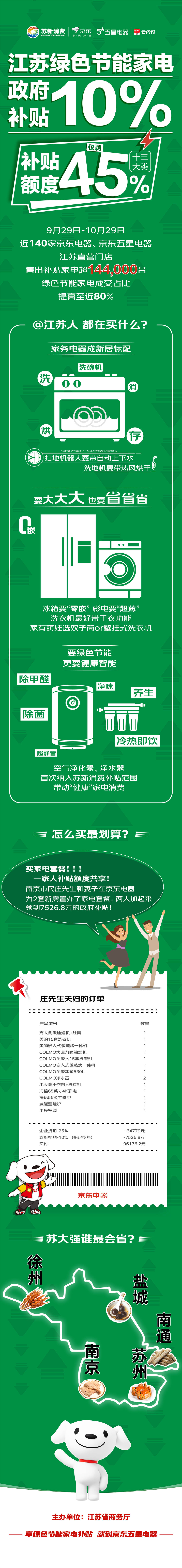 截至目前,苏新消费2亿元补贴资金已不足45%,南京、徐州、苏州、盐城、南通、扬州等城市消费力尤其强劲;在徐州、淮安等县域门店密集的区域,空调、冰洗等四大传统类家电可比增长更超过127%,苏新消费的影响力正持续“绿动”江苏城乡,并将在11.11期间掀起一波高潮。
