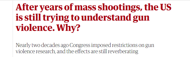 波士顿大学公共卫生学院(Boston University School of Public Health)助理教授乔纳森·杰伊(Jonathan Jay)表示,由于缺乏美国联邦政府资助的关于这一主题的公共卫生研究,使得公众对枪支暴力的理解有限。近几十年来,大多数关于枪支暴力的研究主要集中在警务实践上。与此同时,研究的缺失也限制了美国立法者们对大规模枪支事件的政策理解,杰伊认为官员们会因此更容易忽视受暴力影响最大的群体。