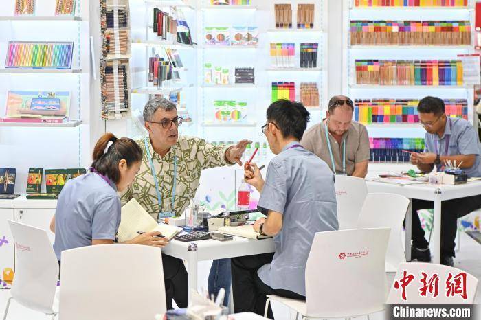 采购商(中)与办公用品参展商洽谈。记者 陈骥旻 摄