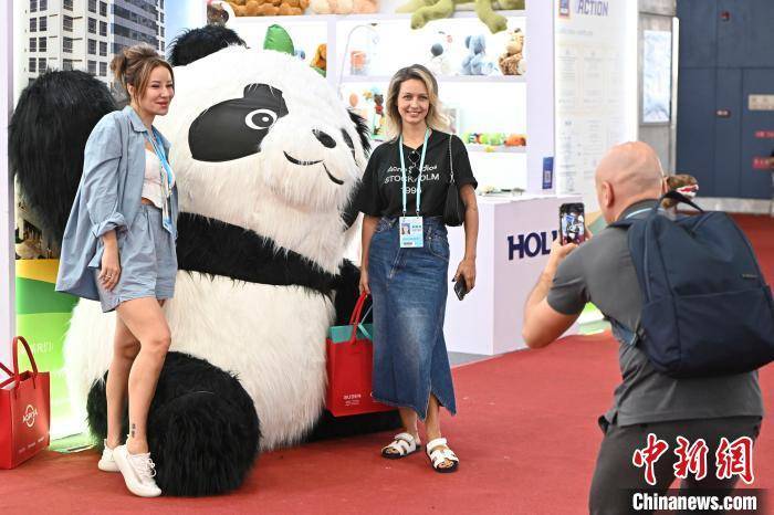 采购商与熊猫毛绒玩具合影。记者 陈骥旻 摄