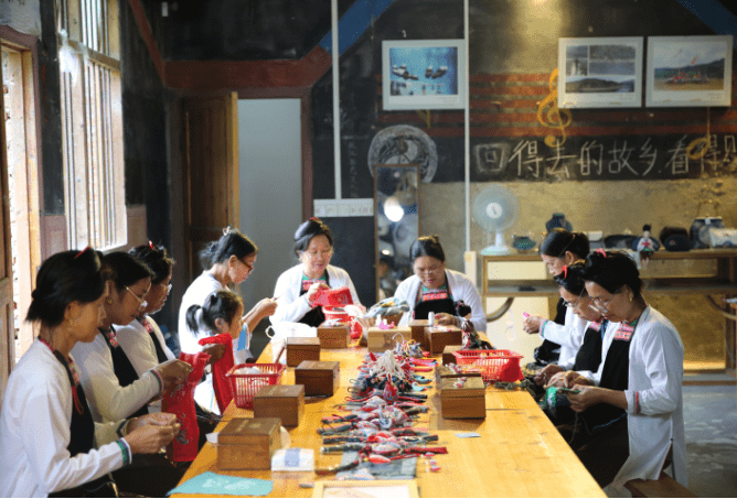 从江县妇联组织侗族妇女在高增乡绣花厂为在外服役的从江籍现役军人制作香包
