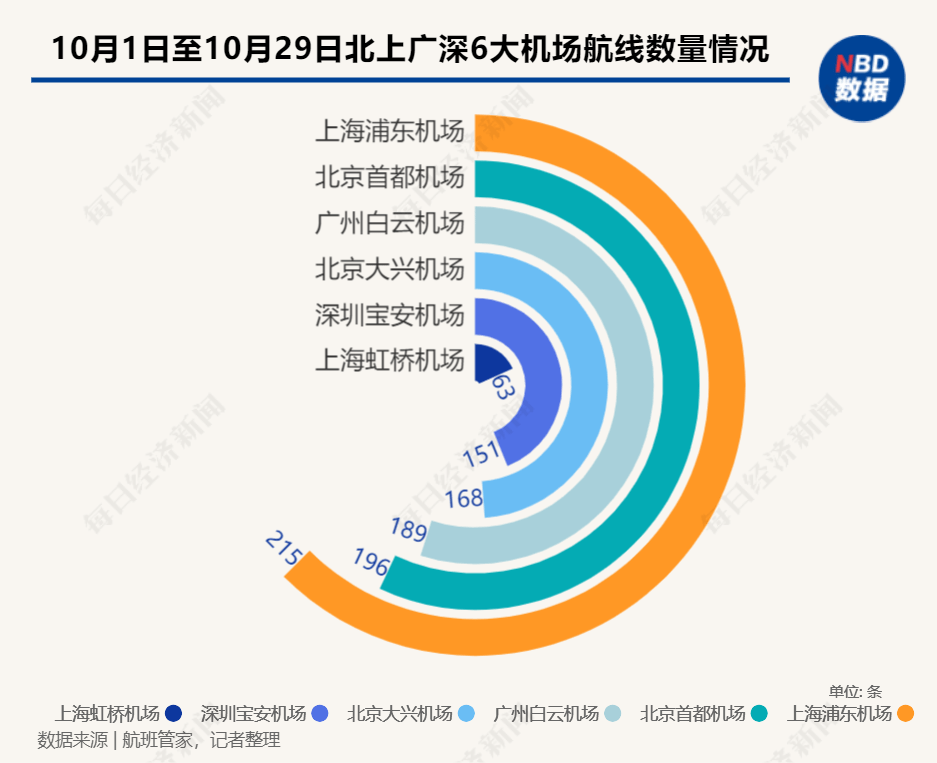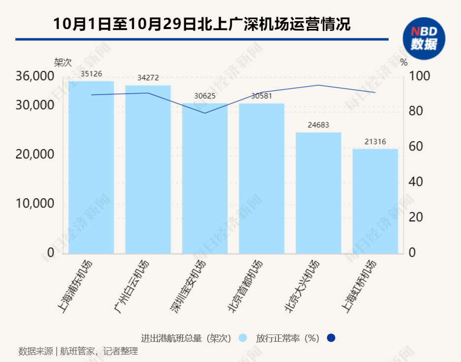 航班管家数据显示,10月1日至29日,北上广深共6个机场中有4个机场进出港航班量超过3万架次,最高的为上海浦东机场,达到35126架次,其次为广州白云机场34272架次,北京首都机场、深圳宝安机场则微超3万架次。
